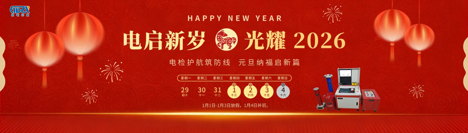 元旦鐘聲送吉祥,喜迎新年新氣象!根據(jù)國家節(jié)假日安排,結合公司實際情況,2026年元旦節(jié)放假安排如下:放假時間:2026年1月1日-1月3日放假,共3天。1月4日(星期日)正常上班。如有業(yè)務事宜請與相關業(yè)務人員聯(lián)系,相關聯(lián)系方式如下:1、產(chǎn)品和服務咨詢熱線:400-0828-027 / 132941535862、電氣試驗技術咨詢熱線:186071457333、售后服務專線:027-65526006萬象更新迎元旦,愿您新年新起點,事業(yè)順遂,諸事皆圓!——【武漢國電中星...